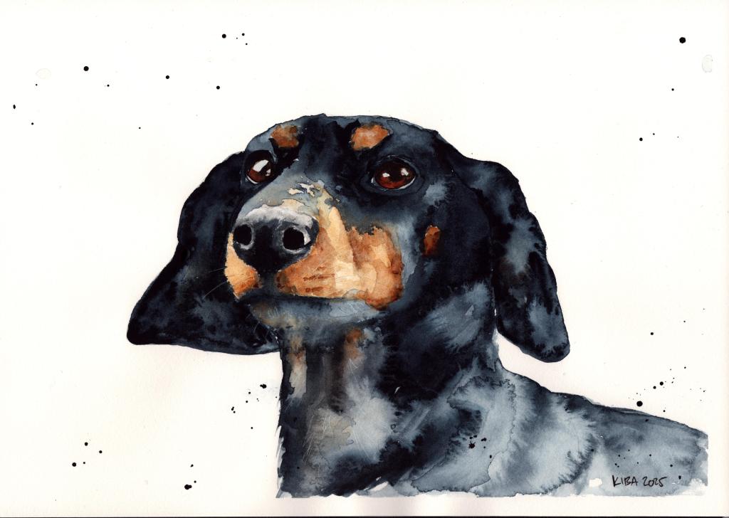 – Jag kallar min stil semirealistisk eftersom jag uppskattar det lekfulla i att inte allt behöver vara fotolikt. Många av de beställningar jag får är på just djurporträtt, och bilden på taxen är ett exempel på hur ett hundporträtt av mig kan se ut. Granskogar är också vanligt förekommande i mina verk där gröna nyanser får skapa ett lugn och en mystik.